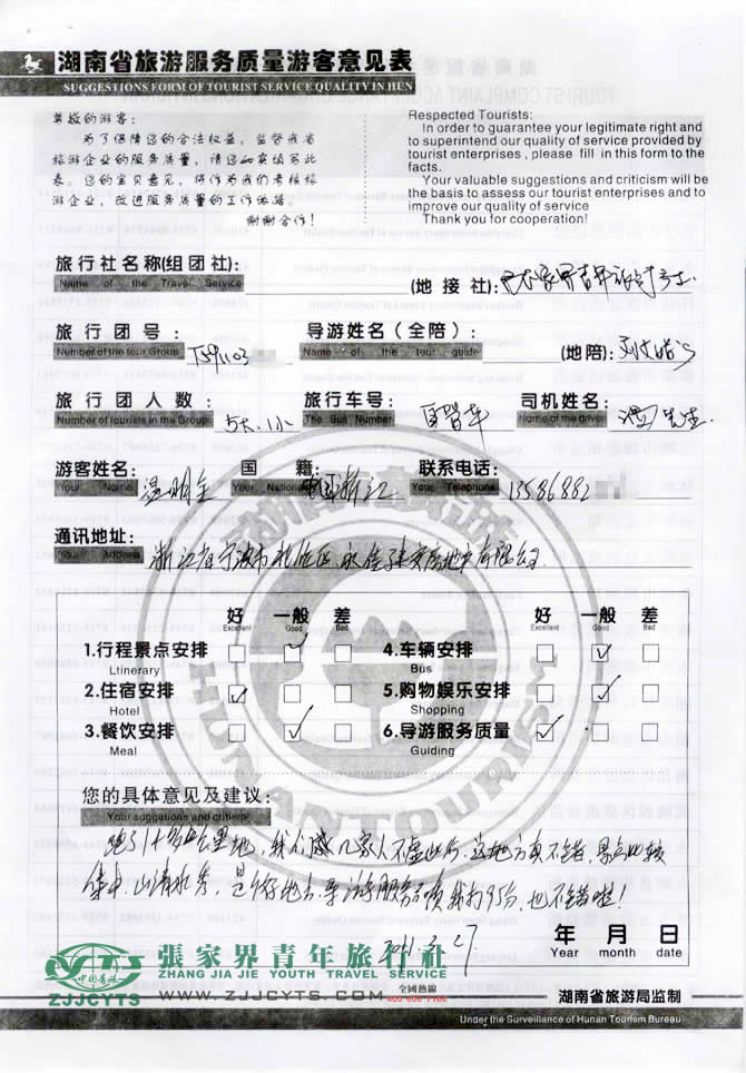 浙江寧波市“溫先生”與張家界青旅旅游顧問——“李 霞”在3月16日取得聯(lián)系,經(jīng)過2次在線溝通商談和電話溝通,最后雙方達(dá)成協(xié)議并簽訂了《國內(nèi)旅游組團(tuán)標(biāo)準(zhǔn)合同》,于3月22日下午抵達(dá)張家界,之后便開始了湘西之旅。 此次行程是由我們優(yōu)秀導(dǎo)游——?jiǎng)⑽木,?fù)責(zé)旅游接待工作,劉導(dǎo)在旅游過程中講解詳細(xì),服務(wù)周到,客人也很滿意。并給予導(dǎo)游服務(wù)品質(zhì)評分95分!