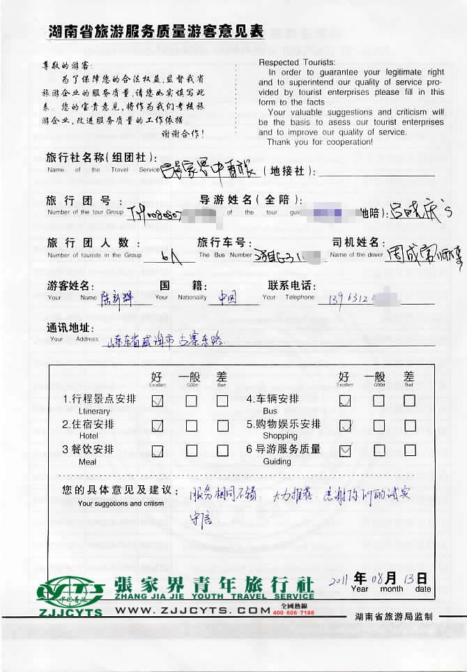 山東威海市“陸先生”與張家界青旅旅游顧問——客服“谷盈”在7月21取得聯(lián)系,并與負責(zé)此次旅行活動的主要聯(lián)系人“陸先生”,就合理的選擇旅游線路、旅游過程的具體要求、服務(wù)范圍、住宿的安排,做了多次在線溝通和電話溝通,經(jīng)過細致的商磋,最終在07月31日正式簽訂《國內(nèi)旅游組團接待合同》,由我社負責(zé)全程接待安排;08月08日陸先生親率貴賓一行6人抵達長沙參加一個座談會議之后,于08月11日在我司長沙分公司工作人員的協(xié)助之下,搭乘城際大巴于當(dāng)日下午13時間許抵達張家界,我社導(dǎo)游和司機迎接站,當(dāng)日便開始了為期3天行程的走進張家界之旅。 08月13日下午送團,貴賓搭乘城市大巴車返程回長沙,后中轉(zhuǎn)返程。